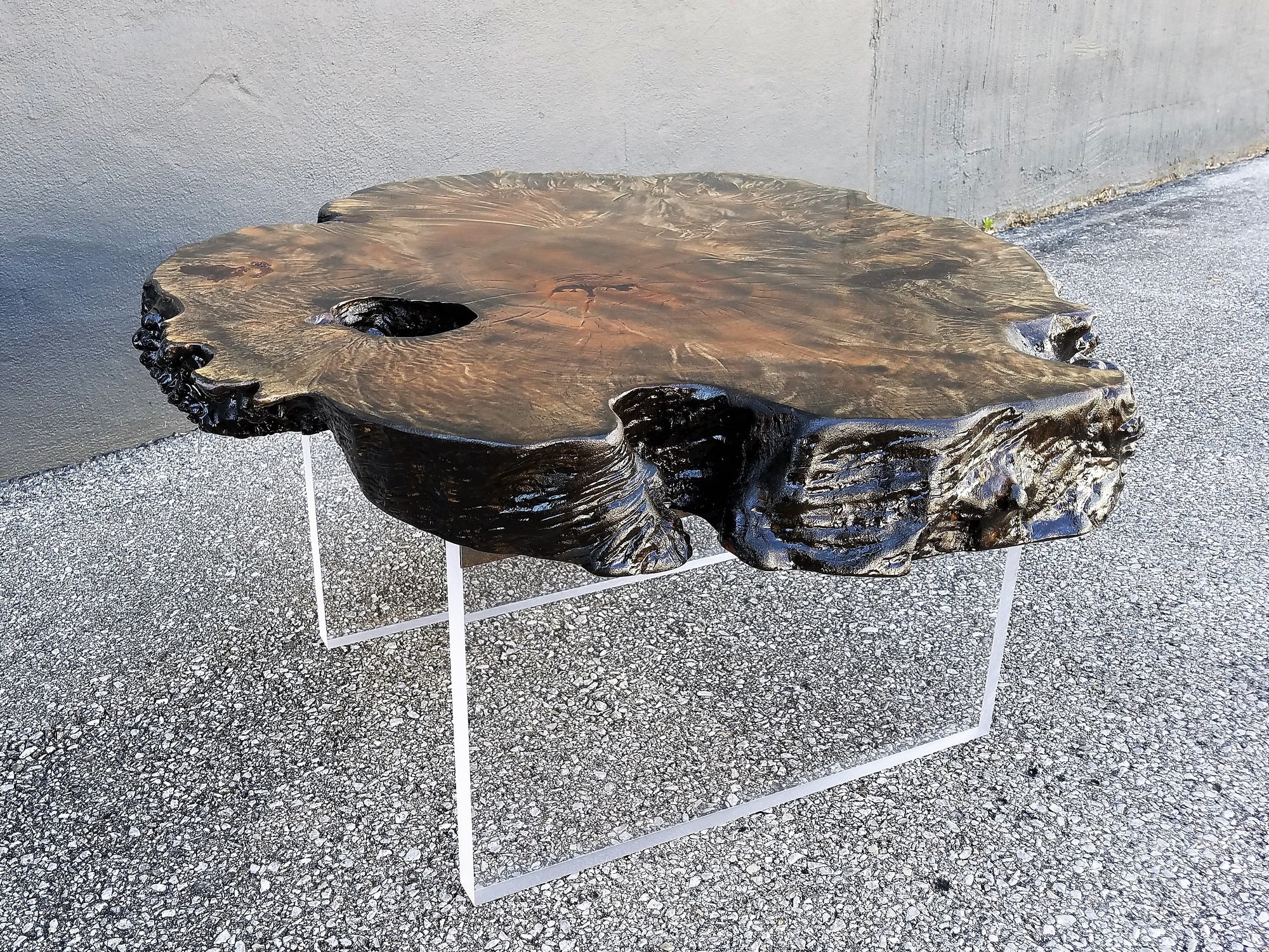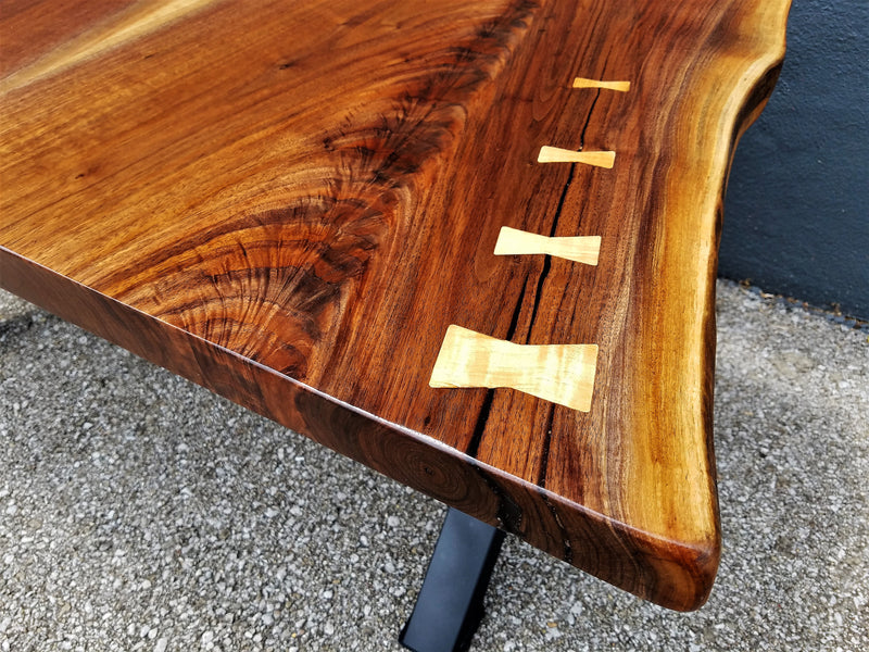 Wood is a hygroscopic material. This means it retains or releases moisture based upon the environment it is in. This process creates actual movement of the wood, usually based off of relative humidity and or heat. This movement is best noted seasonally with expansion and contraction. The seasonal expansion and contraction occurs tangential (across the wood grains/ width) of a live edge slab. Such movement can create drying checks (cracks), twisting, warping, cupping, etc. Drying checks are a natural feature of live edge slabs that are considered character and not flaws. Epoxy-resin fills and hand-carved inlays used to fill in or restrict current drying checks from expanding usually do their job, but this is not to say that lifting or expansion may not occur over time. Wood is a natural product and will do what it wants under certain circumstances, no matter the lengthy amount of thought and prep work put into the raw material or build, nor the care taken by the end user. Below are steps we take to create the best quality products possible, along with a few things for our clients to consider regarding caring for their new purchases.